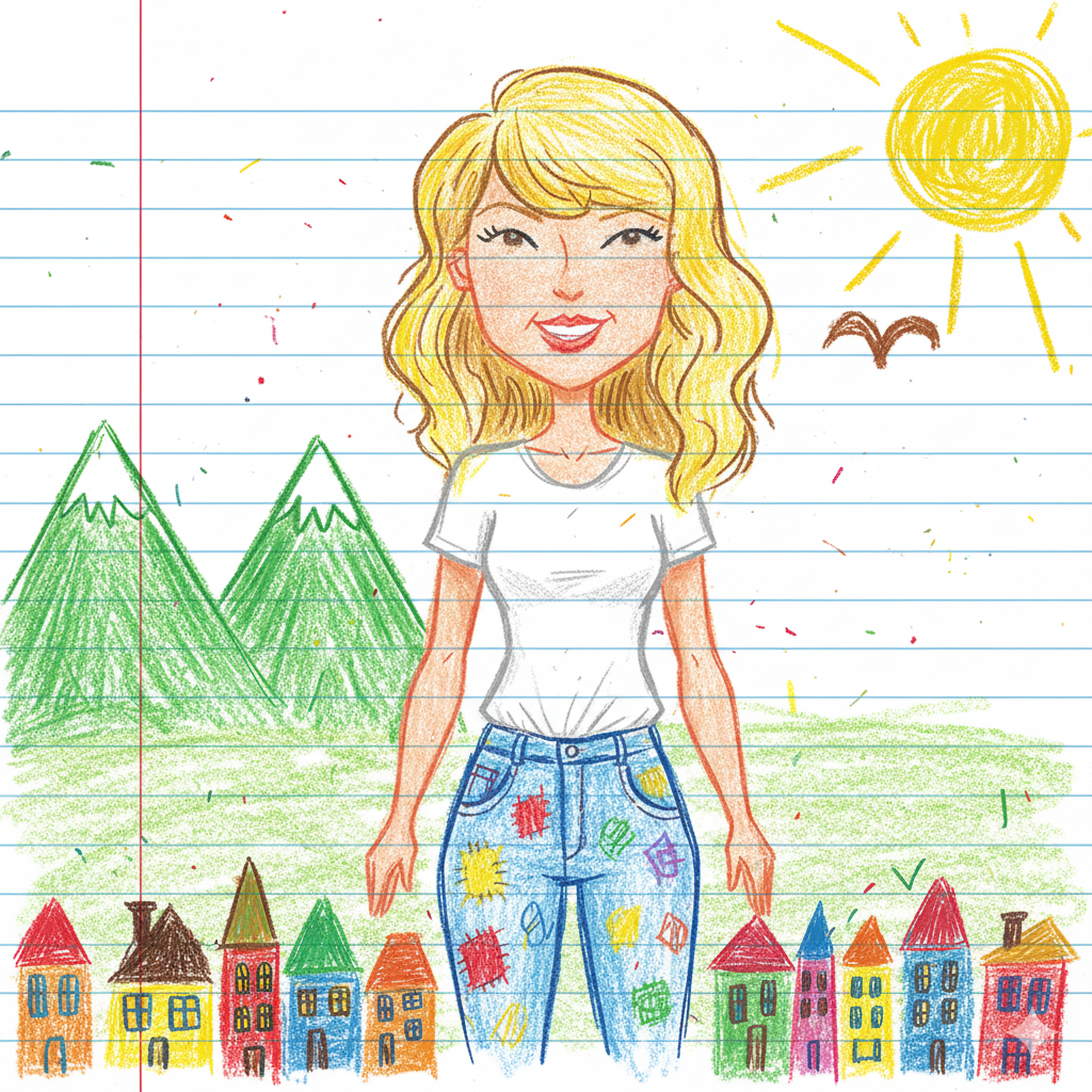 Transform the reference image into a cute crayon-style drawing on lined paper.Keep the original face shape, skin tone, hairstyle, expression, and clothing exactly as in the photo, but reimagine them with rough, uneven strokes and sharp outlines.• Use bright colors and random-looking textures, as if drawn by a child using crayons.Background: Add green crayon-drawn mountains, a bright yellow sun, an “M”-shaped bird, and colorful scribble-style houses.• Place the drawing on blue lined paper with a single red vertical line along the edge.• Maintain the general proportions of the person, but simplify the details to make it look more childlike and caricature-like.• Add some scribbles or imperfections to make it appear spontaneous and playful. 4:5 aspect ratio, notebook-style vertical design.”